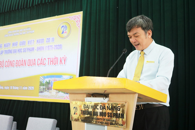 ThS. Huỳnh Bọng – Chủ tịch Công đoàn Khóa IX (nhiệm kì 2017 – 2022) phát biểu chào mừng và tri ân các thầy cô giáo là cán bộ Công đoàn qua các thời kỳ