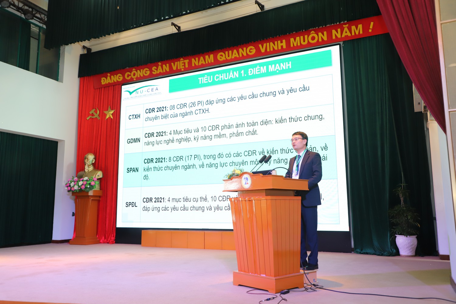 Tại Lễ bế mạc, GS.TS Mai Trọng Nhuận – Trưởng Đoàn và các thành viên Đoàn đánh giá ngoài đã trình bày báo cáo sơ bộ kết quả đánh giá chất lượng 04 CTĐT, đưa ra những nhận xét, đánh giá khách quan về những điểm mạnh trong từng lĩnh vực cụ thể để tiếp tục phát huy trong tương lai, đồng thời Đoàn cũng nêu ra những điểm cụ thể cần cải tiến của từng tiêu chuẩn sau khi phân tích, xem xét kỹ các báo cáo, dữ liệu minh chứng và từ các hoạt động khảo sát thực địa cũng như khảo sát các bên liên quan.