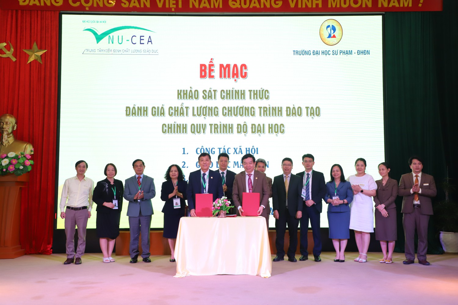 Kết thúc phiên bế mạc, Trưởng Đoàn đánh giá ngoài, đại diện Trung tâm Kiểm định chất lượng giáo dục – Đại học Quốc gia Hà Nội và Đại diện Lãnh đạo Trường Đại học Sư phạm – ĐHĐN đã ký biên bản hoàn thành đợt khảo sát chính thức phục vụ đánh giá chất lượng 04 CTĐT.