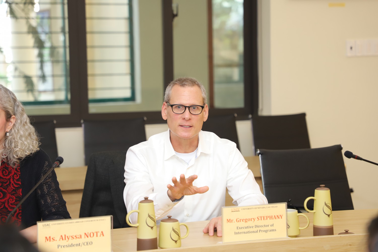 Về phía khách mời: Bà Alyssa Nota, Chủ tịch Hiệp hội Nghiên cứu trường đại học nước ngoài; Ông Gregory Stephany, Giám đốc điều hành Chương trình quốc tế, Đại học Nevada, Hoa Kỳ; Bà Chaidarun Tippawan, Giám đốc Hiệp hội Nghiên cứu trường đại học nước ngoài tại Thái Lan, Cố vấn Khu vực châu Á.