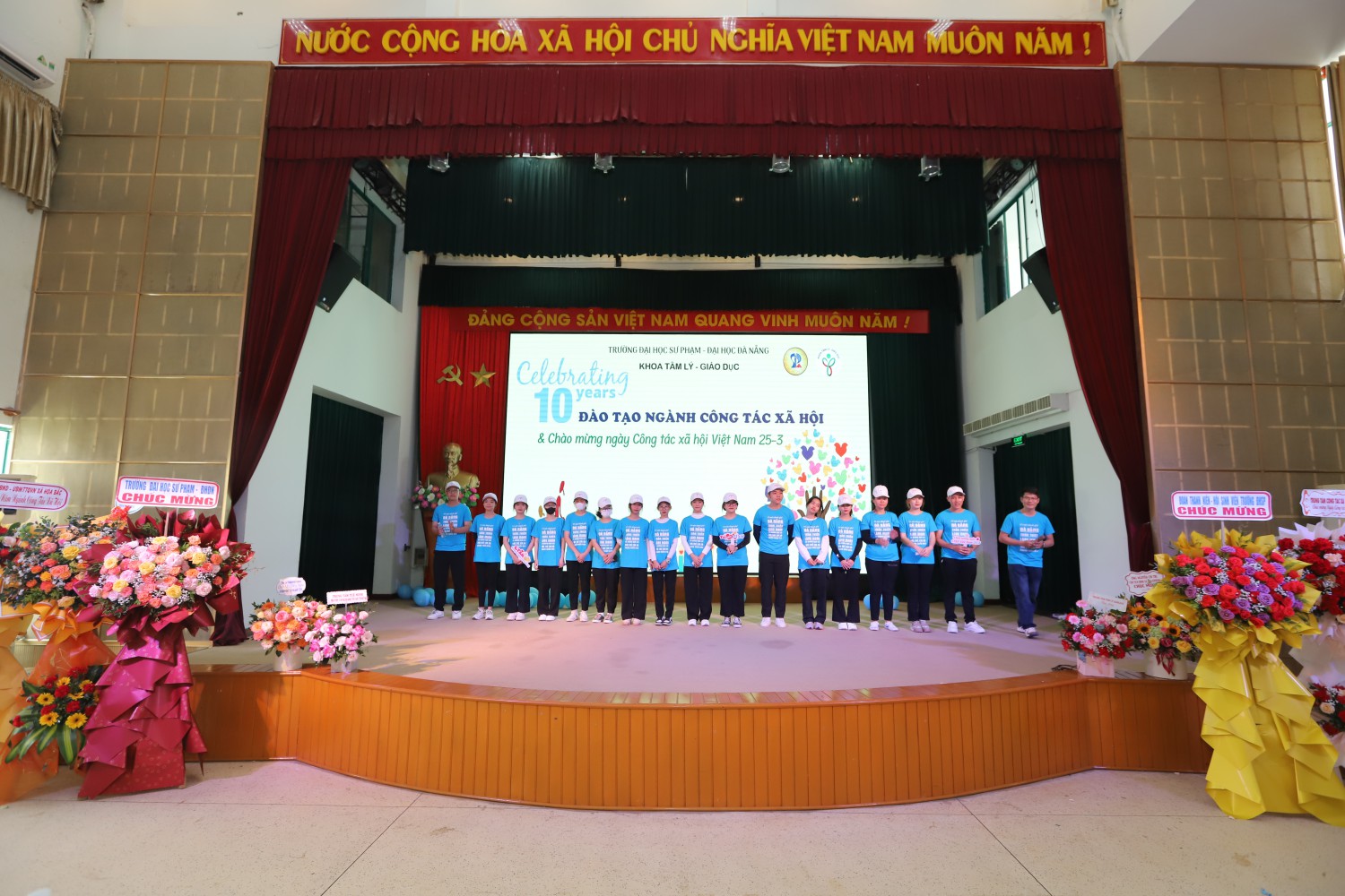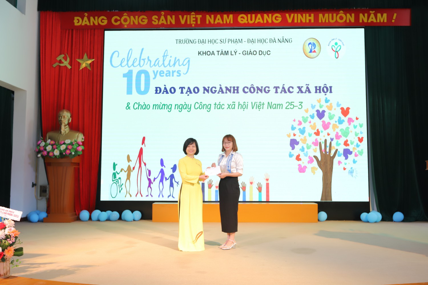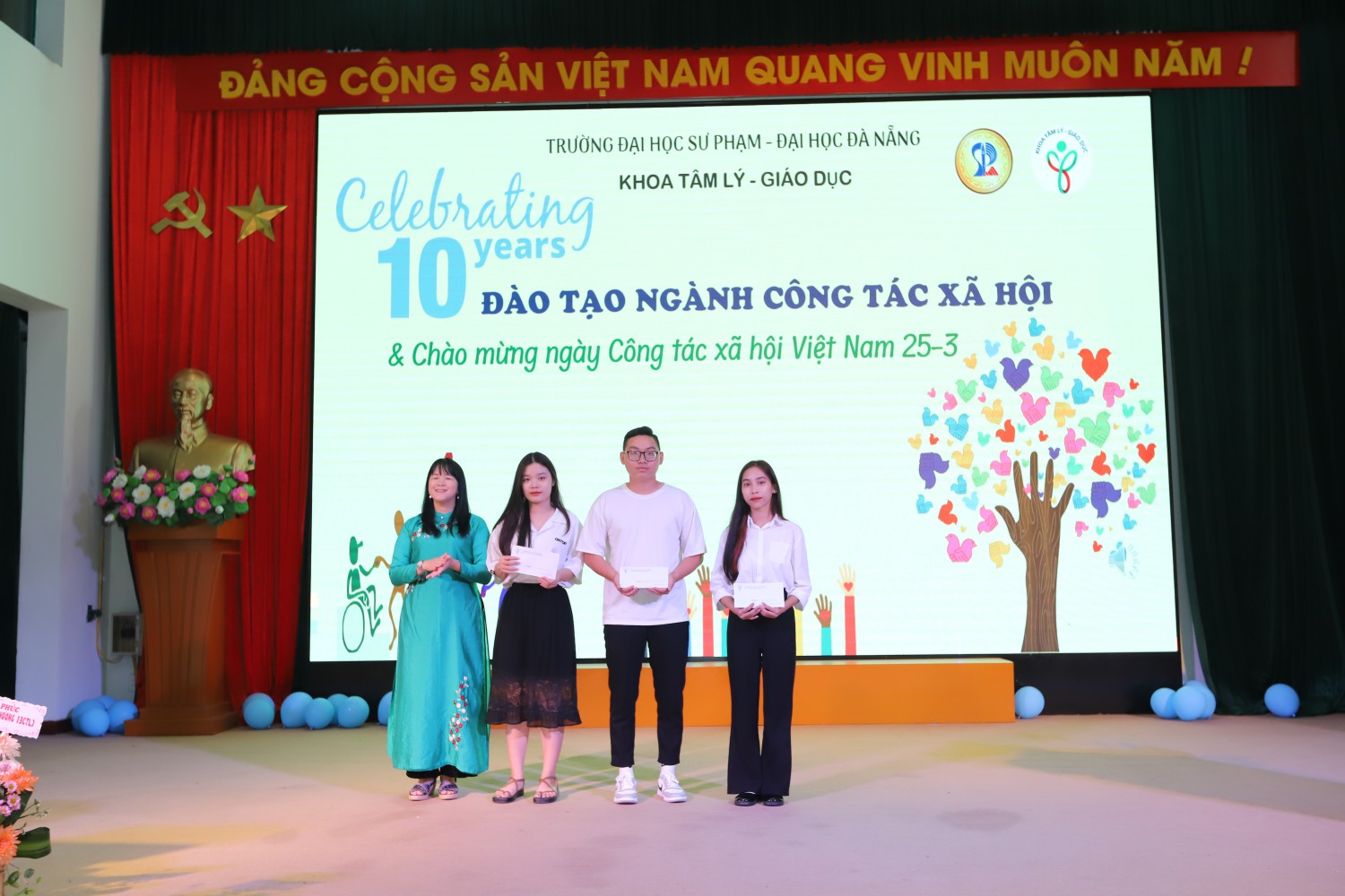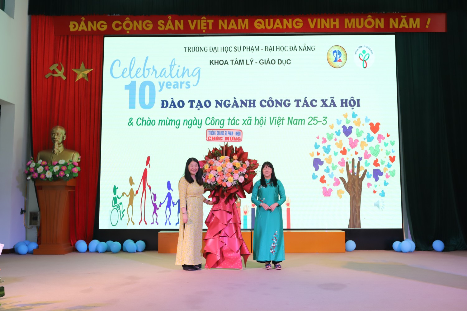 Đến tham dự lễ kỉ niệm, TS. Bùi Bích Hạnh – Phó Hiệu trưởng Nhà trường đã tặng hoa chúc mừng khoa Tâm lý – Giáo dục và cho biết “Hôm nay, rất vui được nói lời chào mừng quý vị đại biểu, quý thầy cô giáo, các thế hệ sinh viên Khoa Tâm lí Giáo dục đang tham dự Kỉ niệm ngày công tác XHVN và 10 năm ghi dấu ngành CTXH của Trường Đại học Sư phạm – ĐHĐN. Tôi thật sự xúc động được chúc mừng sự kiện này.