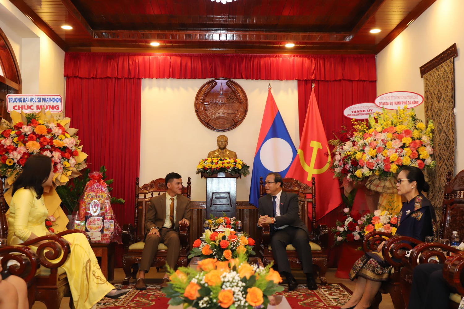 Tổng Lãnh sự Lào tại Đà Nẵng Souphanh HadaoHeuang cảm ơn sự quan tâm của Ban Giám hiệu Nhà trường. Đồng thời chia sẻ niềm vui, vừa qua, Liên hiệp các tổ chức hữu nghị và Hội hữu nghị Việt Nam – Lào thành phố phối hợp với Tổng Lãnh sự quán Lào tại Đà Nẵng, Trường Đại học Sư phạm – ĐHĐN tổ chức Lễ hội Tết cổ truyền Bunpimay với nhiều hoạt động giao lưu văn hóa đặc sắc đã góp phần thắt chặt thêm tình hữu nghị giữa hai nước.