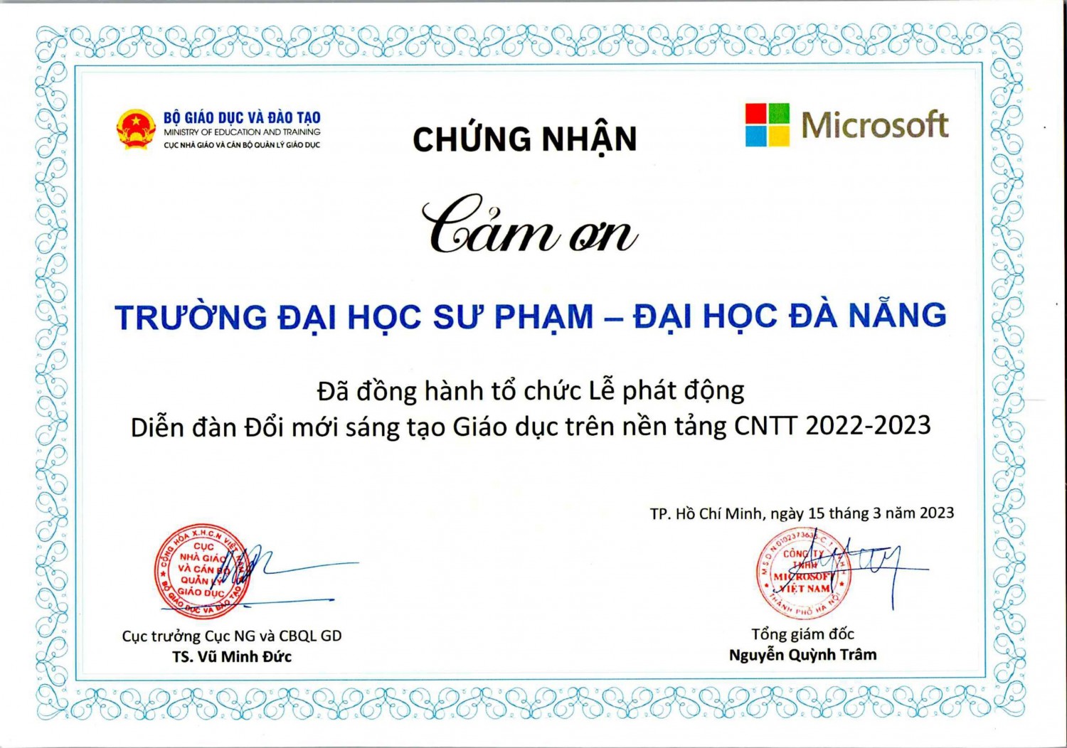 Đại diện Microsoft Việt Nam cho biết, Ban tổ chức cũng như các đại biểu tham gia diễn đàn đều rất ấn tượng và cảm kích trước sự đồng hành nhiệt tình và chuyên nghiệp của Nhà trường. Đây cũng là dịp để các thầy cô giáo từ các đơn vị giáo dục trong cả nước đến tham gia diễn đàn được trải nghiệm và tham quan Trường Đại học Sư phạm – Đại học Đà Nẵng – Một trong những trường đại học sư phạm có môi trường giáo dục tốt nhất hiện nay./