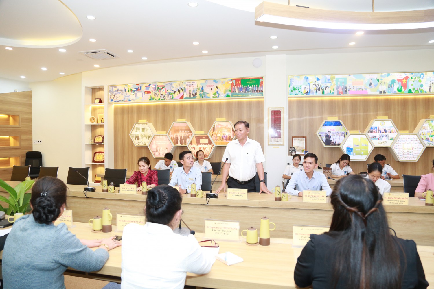 Tại buổi tiếp, đoàn công tác cũng được nghe giới thiệu về Trường Đại học Sư phạm – ĐHĐN, đặc biệt là mô hình dạy Tiếng Việt cho lưu học sinh đa quốc gia, trong đó có lưu học sinh Lào.