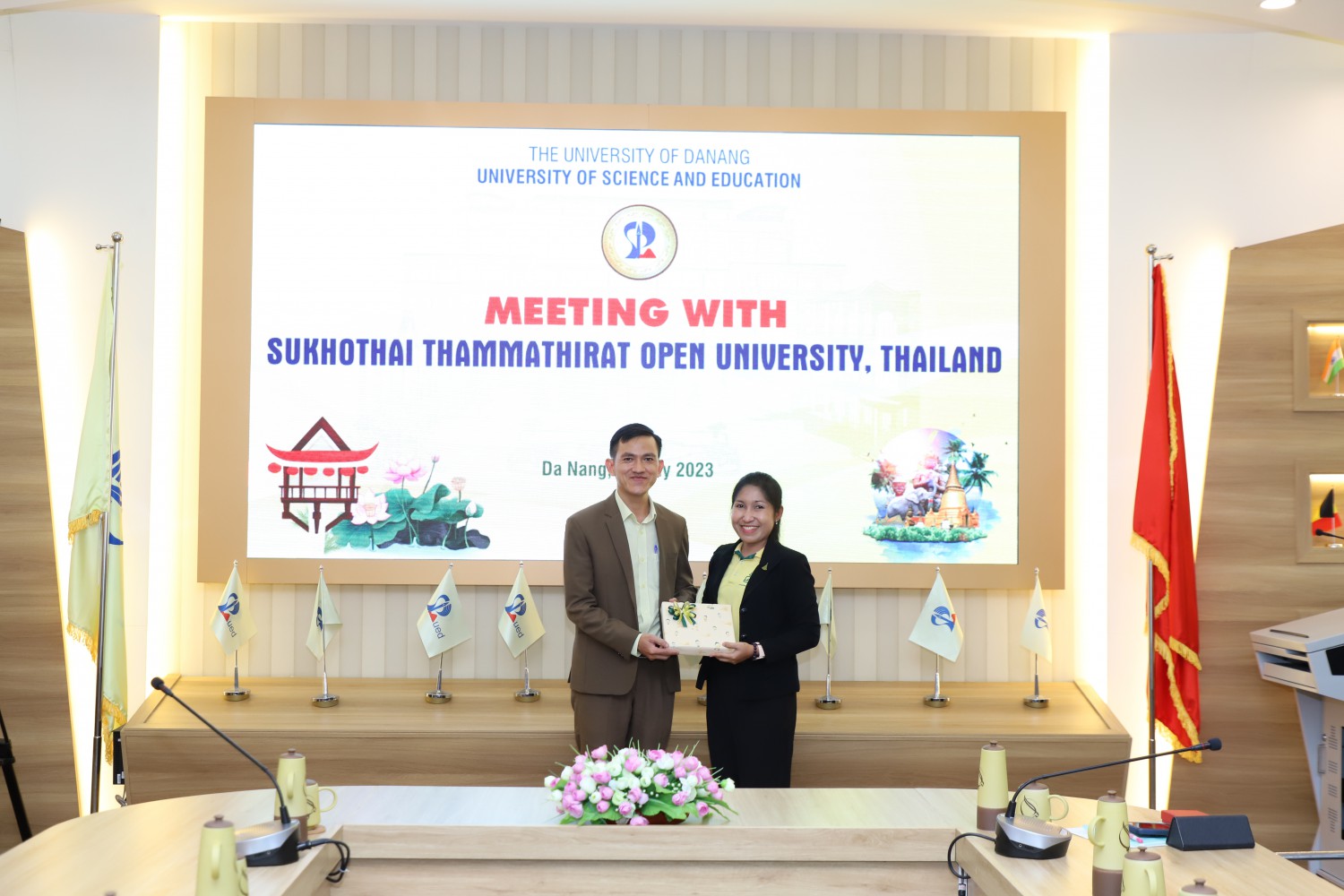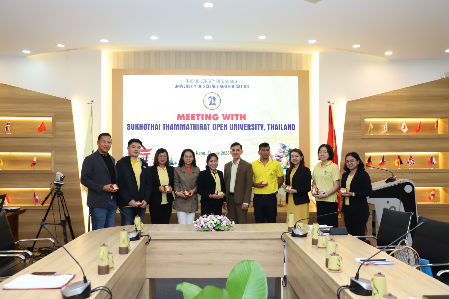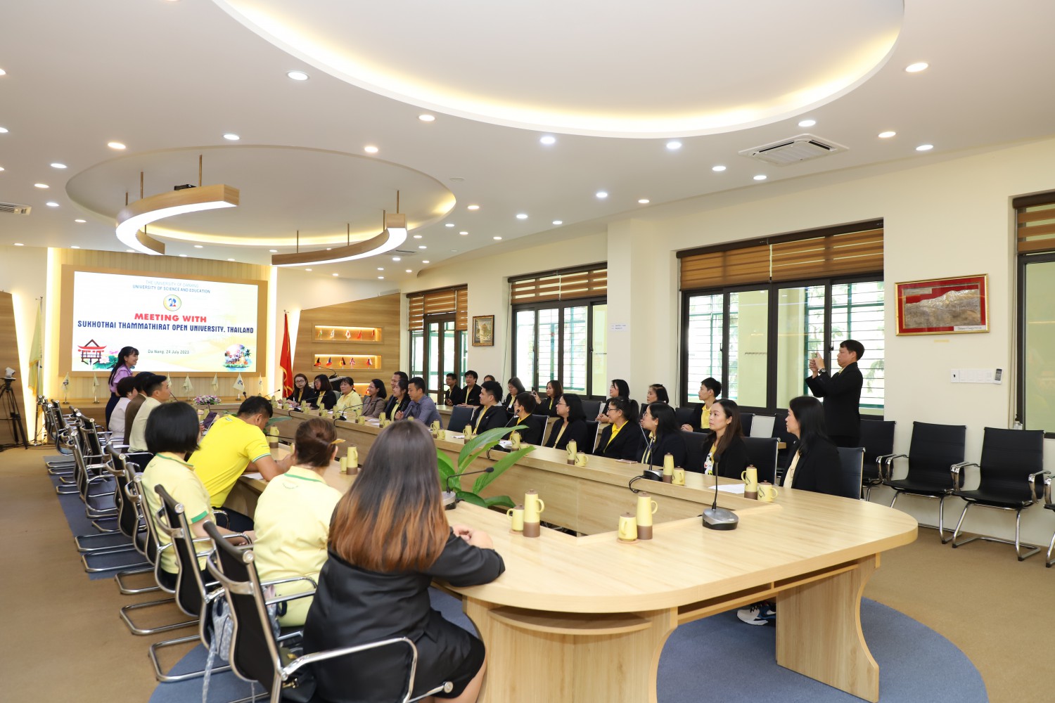 Phát biểu tại buổi làm việc, Đại diện Nhà trường vui mừng chào đón đoàn làm việc đến thăm và trao đổi hợp tác với Trường. Giới thiệu những nét tổng quan, cơ cấu, những nét nổi bật và cho biết Trường Đại học Sư phạm – ĐHĐN luôn sẵn sàng hợp tác với Trường Sukhothai Thammathirat Open University, Thái Lan.
