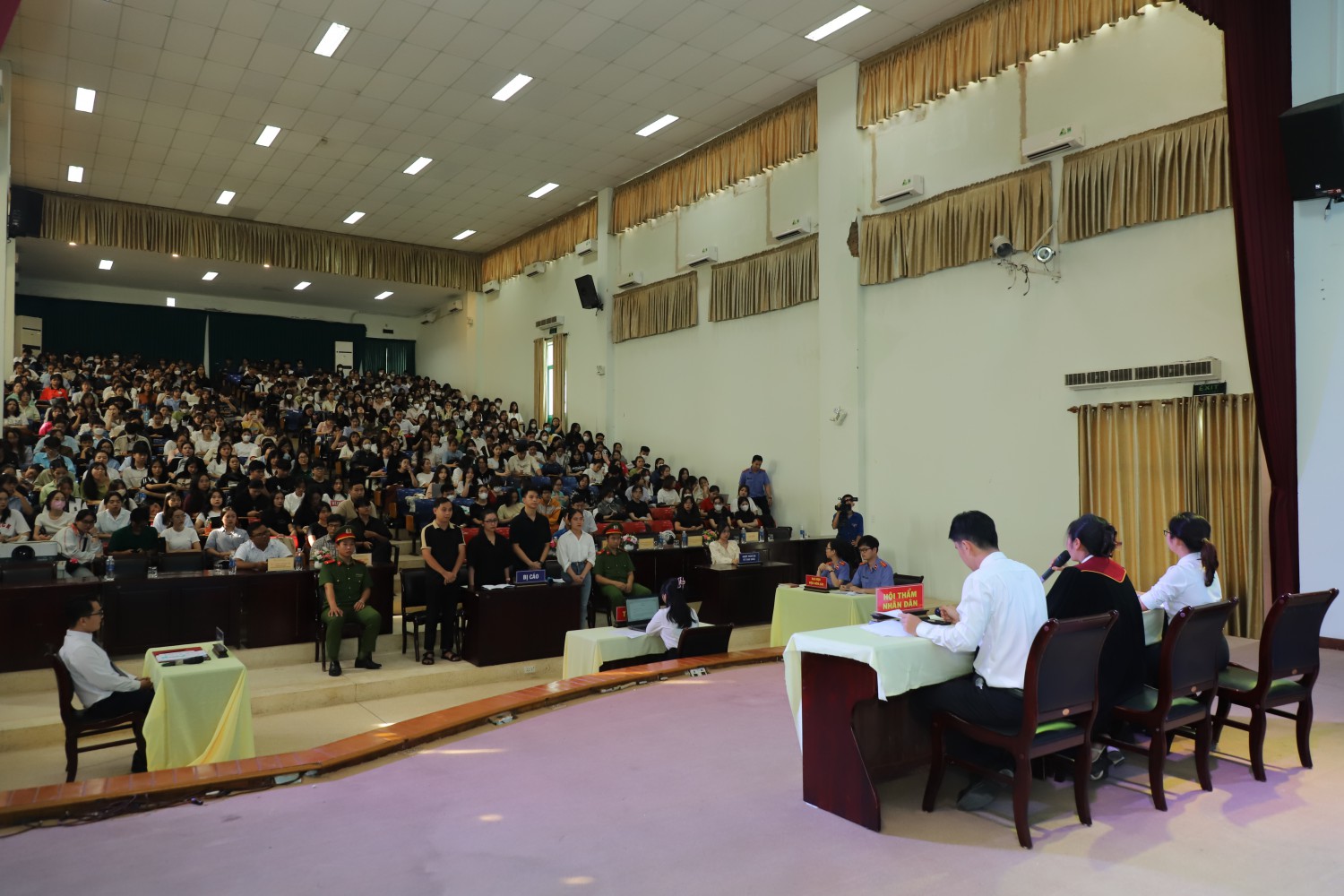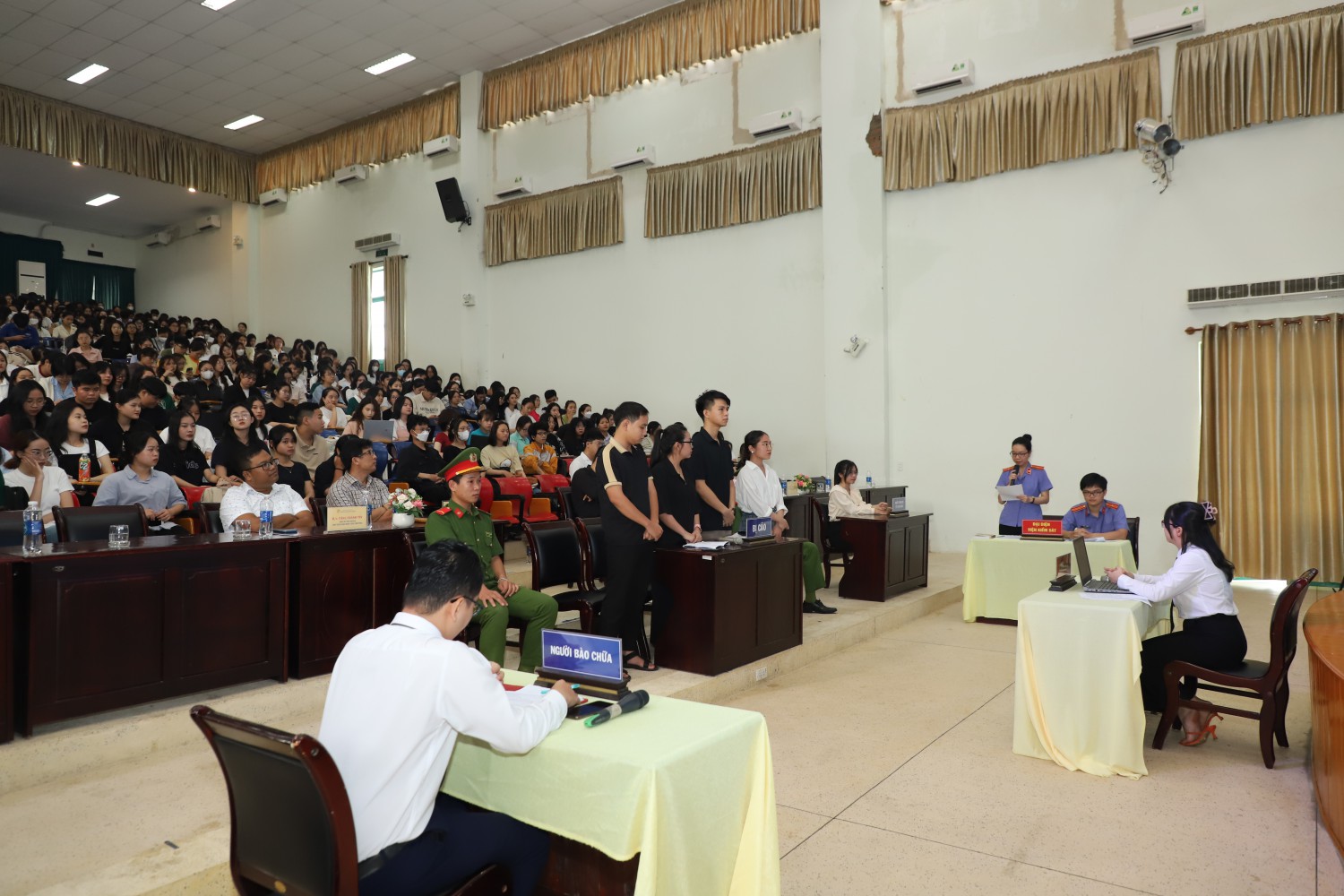 Phiên tòa được dựng lại đúng quy trình tố tụng hình sự về tội danh “Tổ chức sử dụng, mua bán trái phép chất ma túy”. Hàng trăm sinh viên và các đại biểu tham dự đã được chứng kiến các phần xét hỏi, tranh tụng và tuyên án. Kết thúc phiên tòa, người tham dự được trả lời các câu hỏi liên quan đến vụ án nhằm trang bị cho sinh viên thêm kiến thức pháp luật liên quan đến tội danh được xét xử lần này.