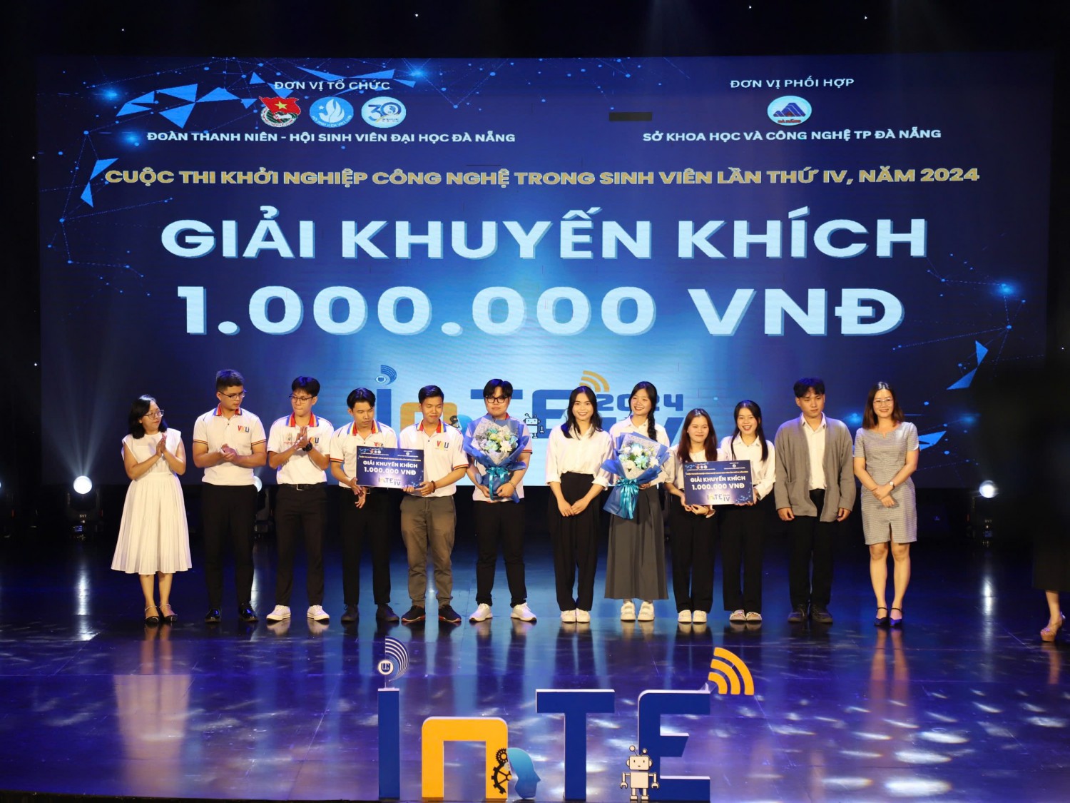 02 Giải Khuyến khích thuộc về nhóm SV Trường Đại học Sư phạm, ĐHĐN với dự án “Sản xuất dung dịch Enzyme đa năng từ phế phẩm thực vật” và SV Trường ĐH CNTT&TT Việt – Hàn, ĐHĐN với dự án “Ứng dụng học phát âm tiếng Việt” với tiền thưởng và Giấy khen của Hội SV ĐHĐN. Ban Tổ chức còn trao 01 bình chọn trên Fanpage cuộc thi, 01 giải tiềm năng và 01 giải ấn tượng cho các nhóm SV dự thi.