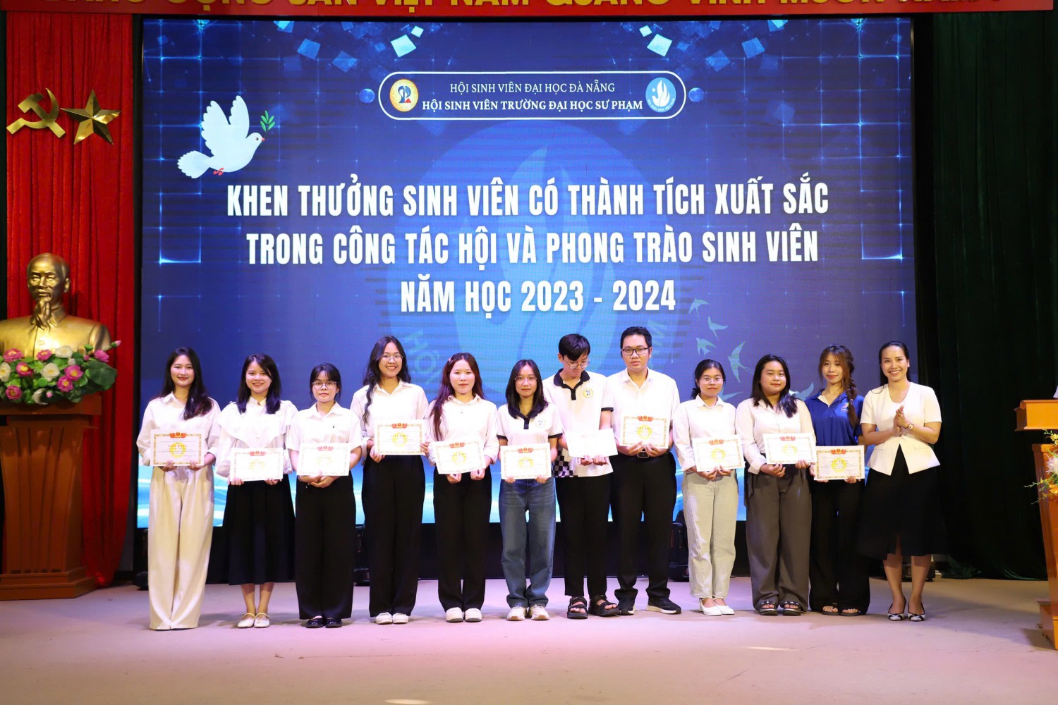 Chương trình đã điểm lại những thành tựu nổi bật trong phong trào sinh viên năm vừa qua, từ các hoạt động tình nguyện đến các sự kiện văn hóa, thể thao. Đồng thời, Ban Chấp hành Hội Sinh viên Trường Đại học Sư phạm – ĐHĐN đã ghi nhận và khen thưởng 109 cá nhân đến từ các CLB, đội, nhóm có thành tích xuất sắc, có sự đóng góp tích cực vào phong trào sinh viên năm học 2023 – 2024.