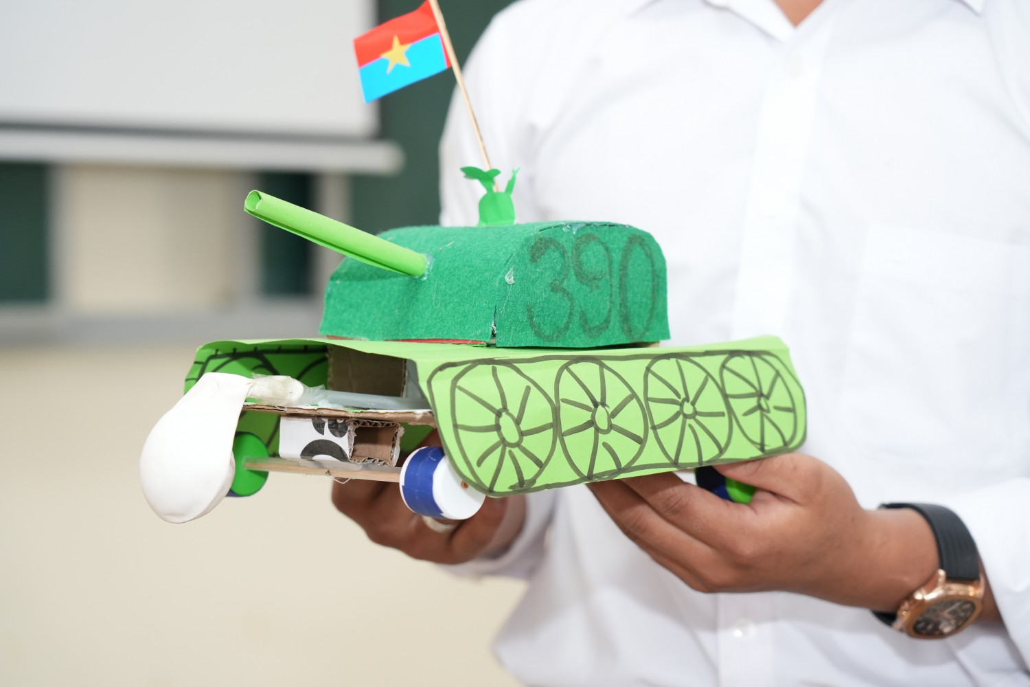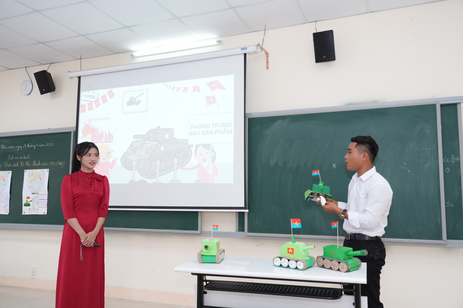 Một trong những điểm nhấn đặc biệt là hoạt động tái hiện lại trận chiến lịch sử đánh chiếm Dinh Độc Lập ngày 30/4/1975 do chính các bạn sinh viên thực hiện. Với sự sáng tạo và tinh thần trách nhiệm cao, hình ảnh lá cờ đỏ sao vàng tung bay trên nóc Dinh – biểu tượng của chiến thắng lịch sử – đã được tái dựng sống động ngay trong lớp học, qua tiểu phẩm, hình ảnh và âm thanh chân thực. Khoảnh khắc ấy không chỉ gợi nhắc về một dấu ấn huy hoàng của dân tộc mà còn khơi dậy niềm tự hào sâu sắc, hun đúc ý chí vươn lên và tinh thần dấn thân trong mỗi sinh viên trẻ.