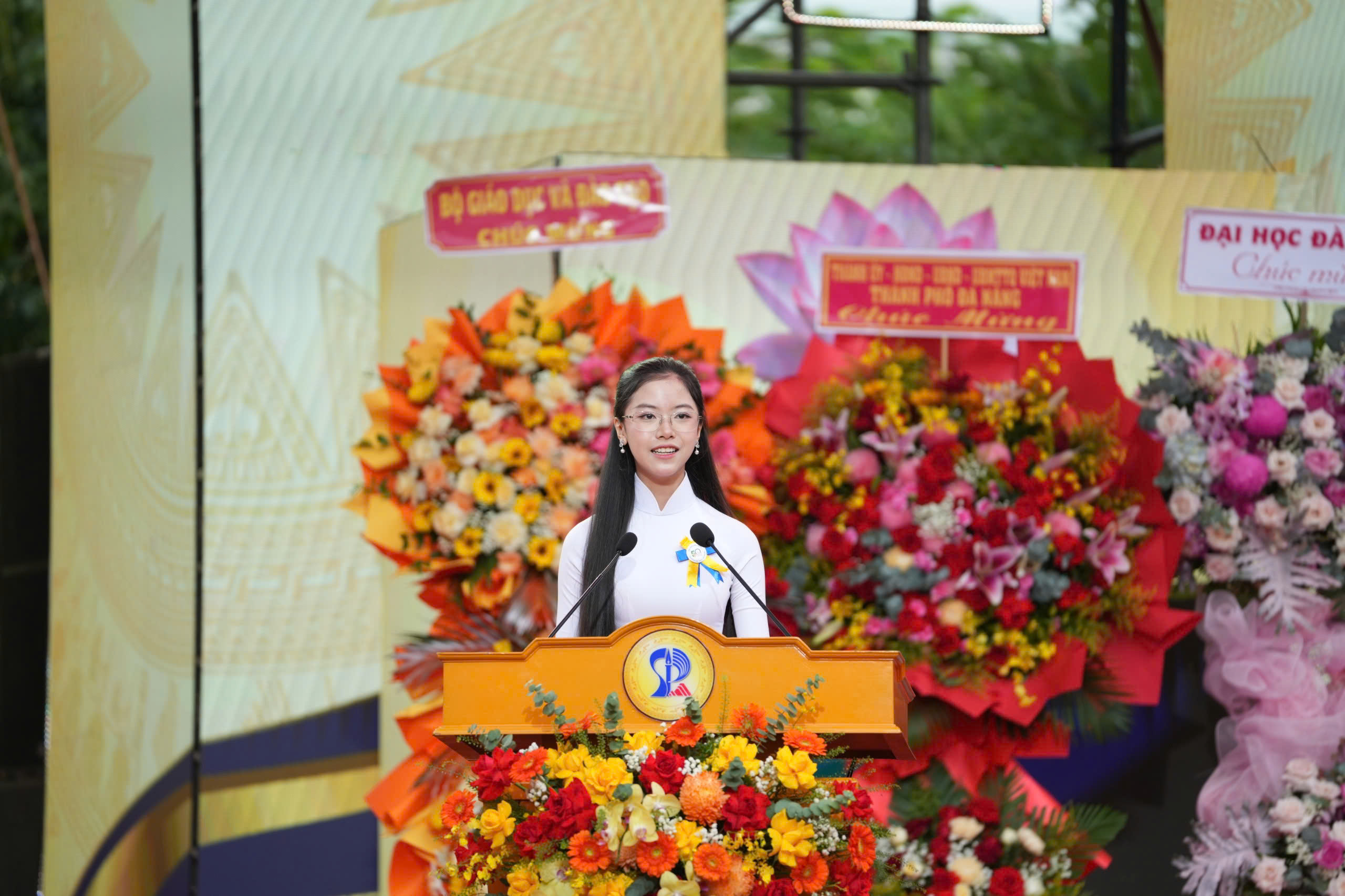 Sinh viên Phạm Minh Thư, đại diện người học của Trường phát biểu tại Lễ kỷ niệm.
