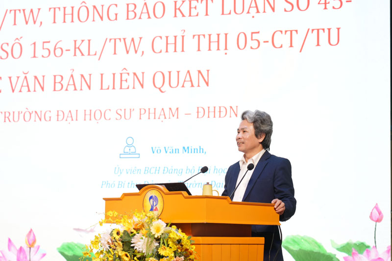 Tại hội nghị, đồng chí Võ Văn Minh, Ủy viên Ban Chấp hành Đảng bộ Đại học Đà Nẵng, Phó Bí thư Đảng ủy, Hiệu trưởng Trường Đại học Sư phạm đã báo cáo quán triệt những nội dung quan trọng của các văn bản. Nghị quyết 71-NQ/TW xác định giáo dục – đào tạo là quốc sách hàng đầu, nhấn mạnh chất lượng là trục, giáo viên là then chốt, công nghệ là đòn bẩy, hướng tới đào tạo nhân lực chất lượng cao, đến năm 2045 nằm trong nhóm 20 quốc gia hàng đầu về giáo dục. Thông báo 45-TB/TGV đề cao phát triển khoa học công nghệ, đổi mới sáng tạo, chuyển đổi số và mô hình hợp tác “Nhà nước – Nhà trường – Doanh nghiệp”. Kết luận 156-KL/TW tiếp tục thực hiện Nghị quyết 33 về xây dựng và phát triển văn hóa, con người Việt Nam toàn diện, coi văn hóa và con người là nguồn lực nội sinh, động lực phát triển. Chỉ thị 05-CT/TU yêu cầu đẩy mạnh cải cách hành chính, tăng cường kỷ luật, kỷ cương trong thực thi công vụ tại Đà Nẵng, gắn cải cách với chuyển đổi số và nâng cao hiệu quả phục vụ.