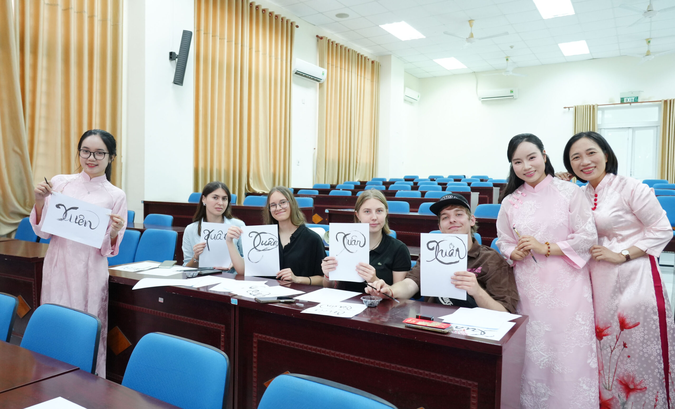 Ngọc Trang (mặc áo dài hồng phía trái) và các lưu học sinh trải nghiệm viết thư pháp.