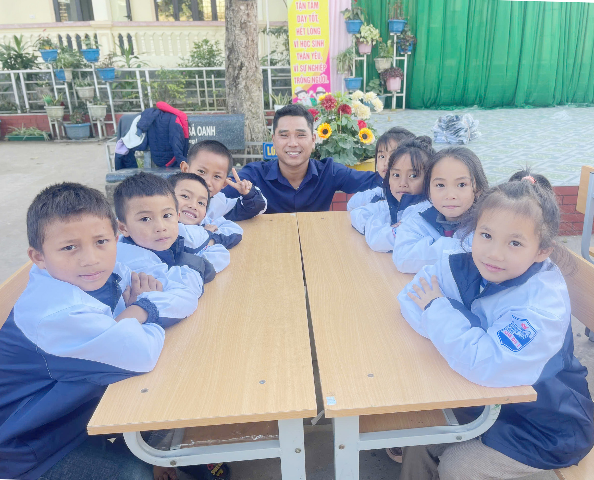 Thầy giáo Xeo Văn Hồng cùng học sinh của mình tại Trường TDTBT Tiểu học Keng Đu.
