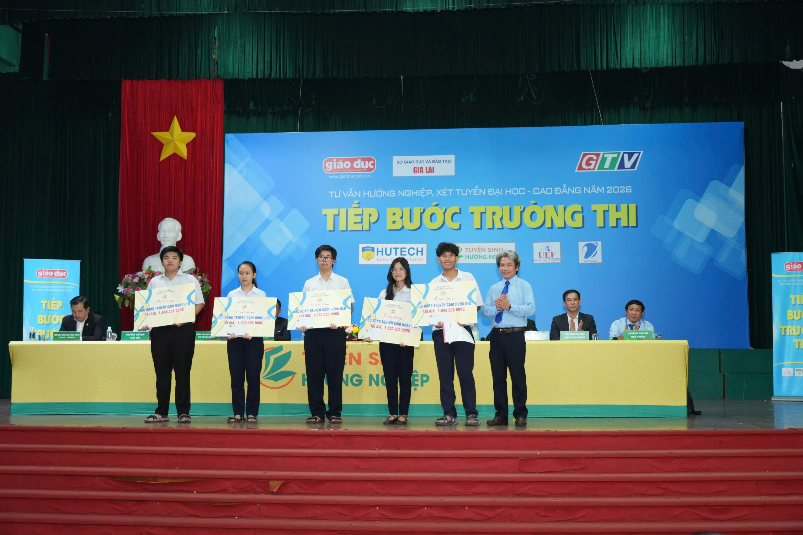 Trong các Chương trình tư vấn hướng nghiệp, xét tuyển đại học – cao đẳng năm 2026 tại Quảng Ngãi và Gia Lai lần này, UED đã trao 10 suất học bổng “Truyền cảm hứng UED” (Quỹ học bổng do viên chức, NLĐ Nhà trường sáng lập và duy trì từ năm 2021). Trong ảnh: Hiệu trưởng UED trao học bổng cho học sinh THPT tỉnh Gia Lai.