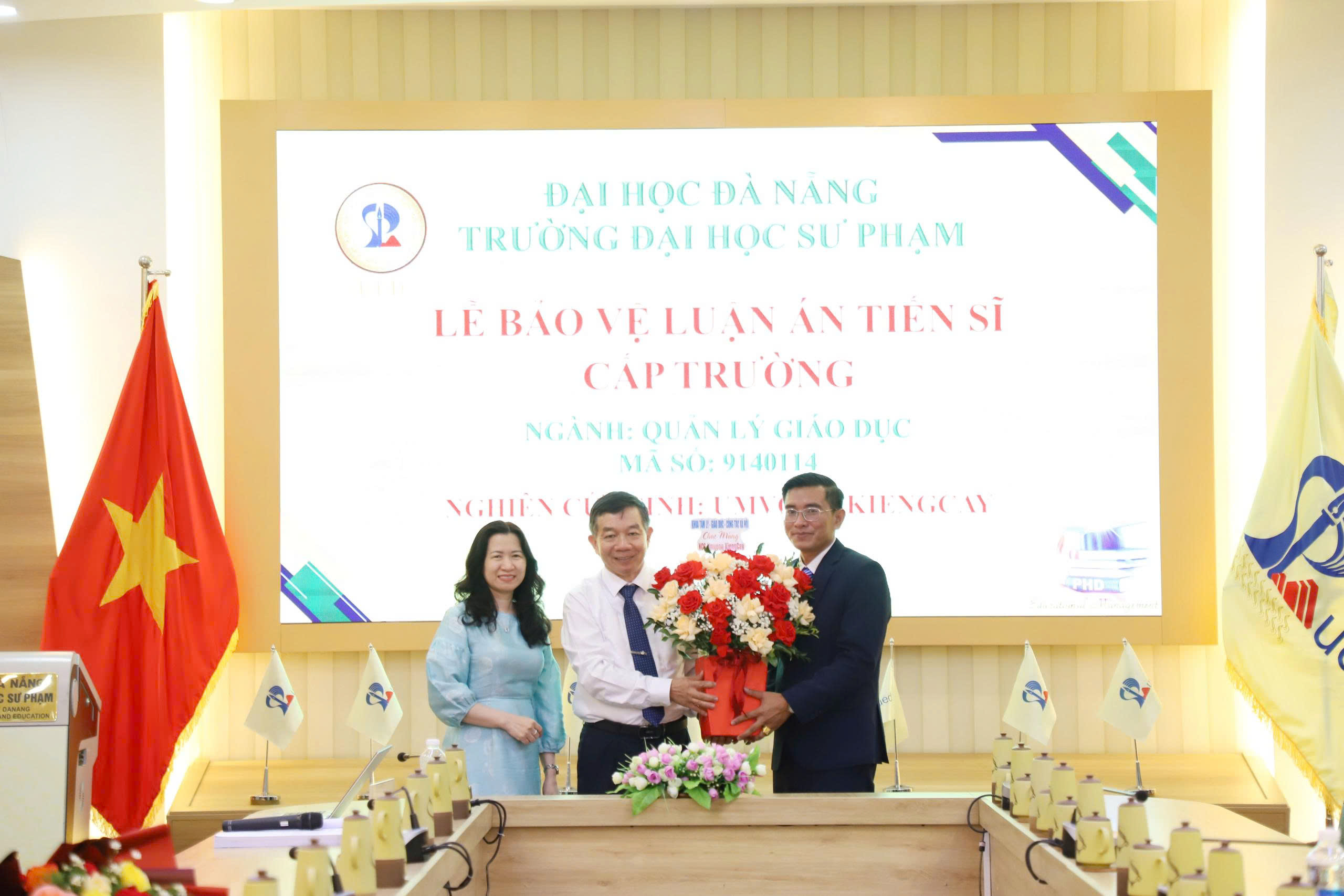 Đại diện cơ sở đào tạo tặng hoa chúc mừng NCS.