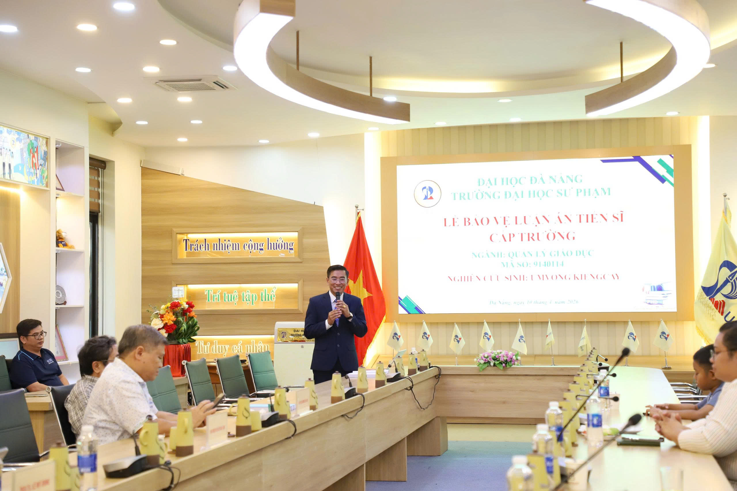 Nghiên cứu sinh Umvong Kiengcay tham gia chương trình đào tạo tiến sĩ theo diện học bổng do thành phố Đà Nẵng tài trợ. Quá trình học tập và nghiên cứu tại Trường Đại học Sư phạm – Đại học Đà Nẵng, nghiên cứu sinh thể hiện tinh thần học thuật nghiêm túc, chủ động trong nghiên cứu và tích cực tham gia các hoạt động giao lưu, hợp tác, góp phần tăng cường mối quan hệ hữu nghị, hợp tác giáo dục giữa Nhà trường với các địa phương Trung – Nam Lào.