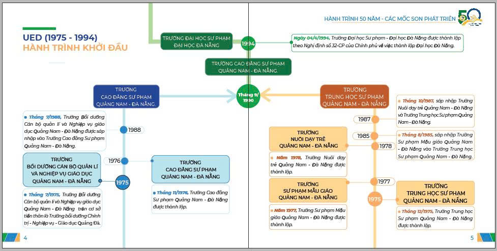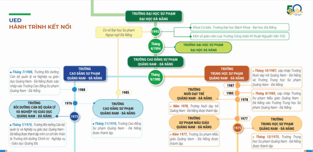 Hành trình 50 năm kết nối và phát triển của Trường Đại học Sư phạm – ĐHĐN là câu chuyện đầy tự hào về sự trưởng thành và cống hiến không ngừng cho sự nghiệp giáo dục. Từ dấu mốc thành lập (năm 1975) đến khi trở thành một đơn vị thành viên của Đại học Đà Nẵng (năm 1994), UED đã trải qua nhiều giai đoạn chuyển mình mạnh mẽ. Mỗi cột mốc đều ghi dấu sự nỗ lực nâng cao chất lượng đào tạo, nghiên cứu và phục vụ cộng đồng.