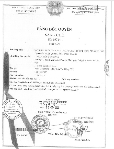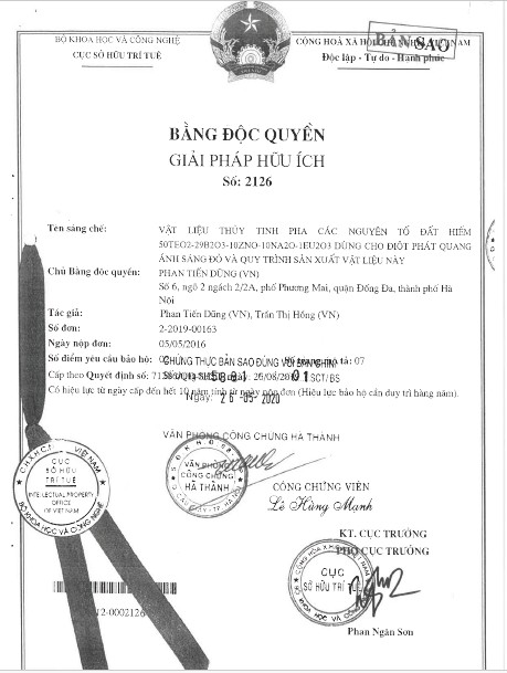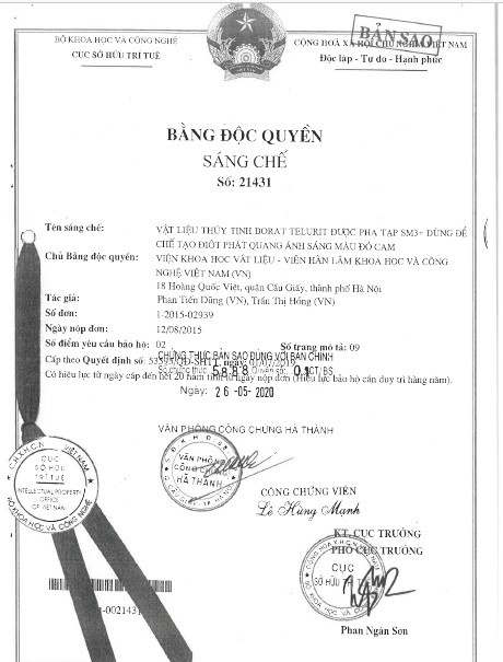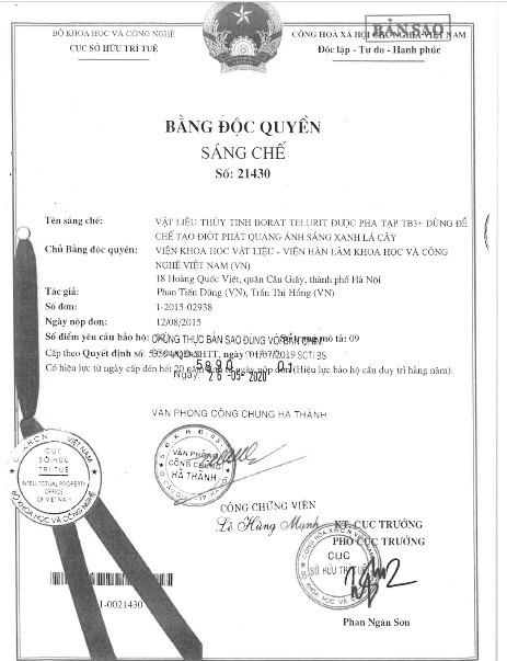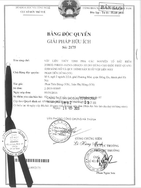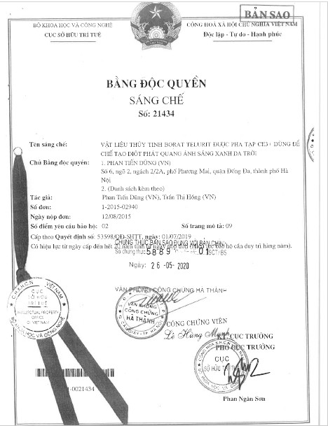Bằng độc quyền sáng chế: Vật liệu thủy tinh Borat Telurit được pha tạp Ce3+ dùng để chế tạo Điốt phát quang ánh sáng xanh da trời